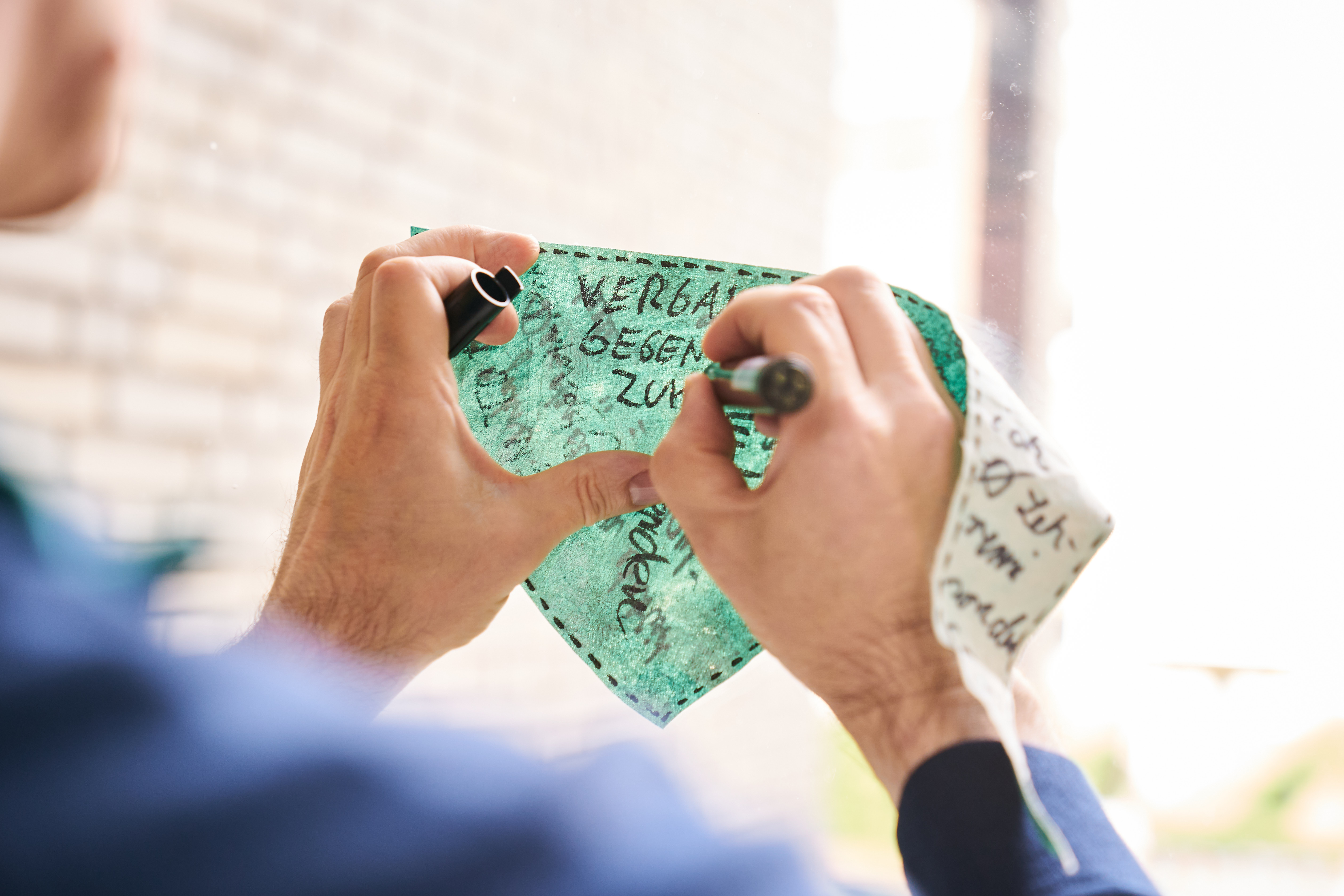 Historically, handkerchiefs often served as a medium for printing important social events. They were silent witnesses to tears, stories, love messages, and goodbyes, thus symbolizing personal narratives that are often not represented by traditional monuments. The sculpture "Handkerchief" depicts a textile sheath that transitions into a knotted handkerchief held in the arm, commonly signifying a memory prompt. Just as different personalities can be projected onto the sculpture, the work is not about one privileged perspective, but the exchange of knowledge and memories.