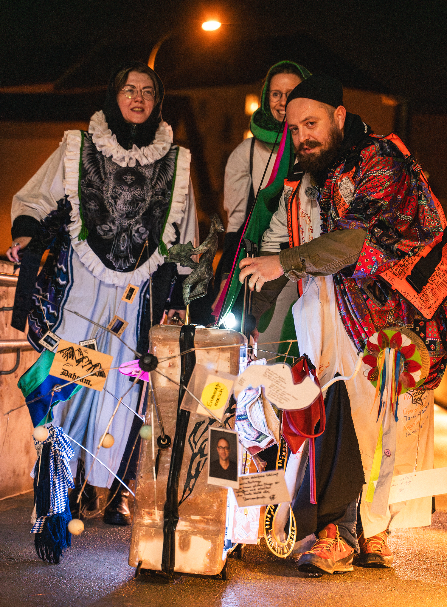 The city walk, hosted by the Memory Person performers Polina Kathsenka, Jegor Kondratyuk, and Franziska Windolf, began at the central station and rounded off at the House of Arts. The walk featured a modified lightbox suitcase, which served as a central element of the performance.